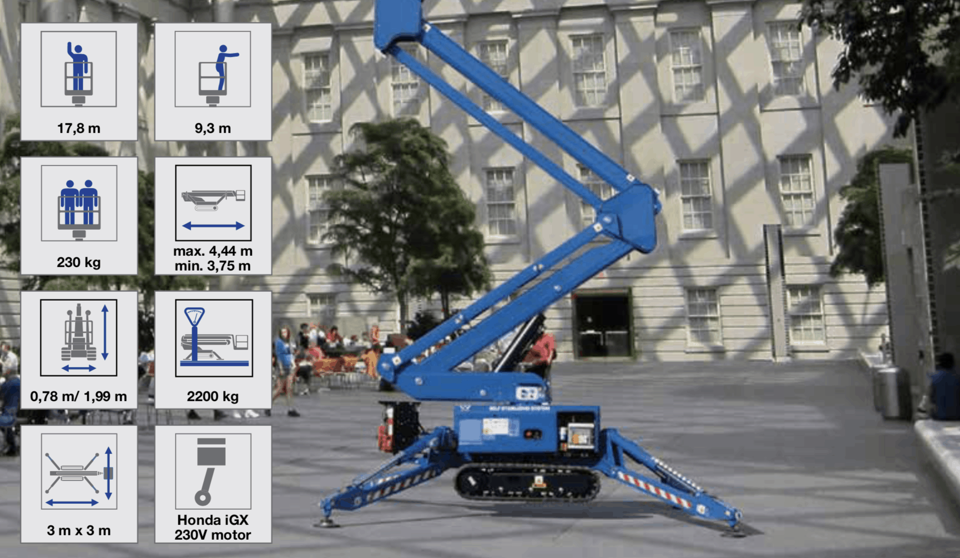 They are favourable in pricing, popular and diversely suited for various indoor and outdoor applications. BLUELIFT spider platforms are well-known for their advanced technology, their low overall weight, high performance and compact dimensions. Furthermore, they are easy to use.